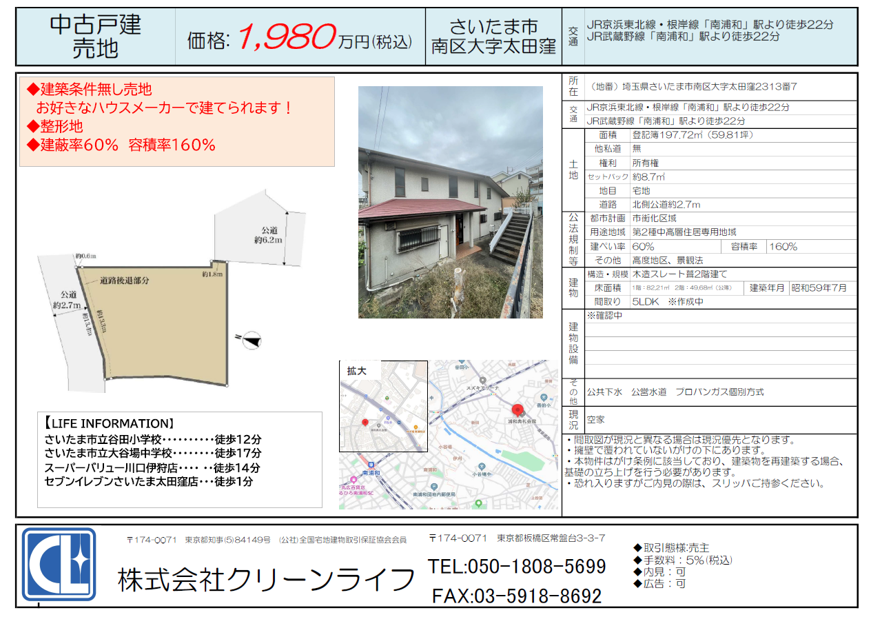 (住居表示)埼玉県さいたま市南区大字太田窪2313番7価格:1,980万円